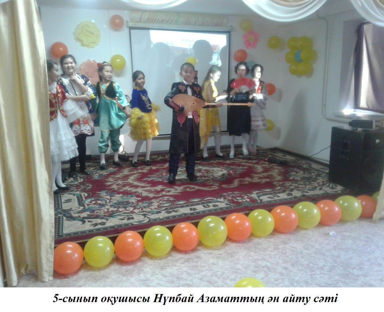 5-7 сыныптар аралығында қатысқан оқушылардың арасынан «Хан мен Ханшайым» таңдалып алынды. Атап айтсақ, Нүпбай Азамат 5 «А» сынып оқушысы, Бақберген Балауса 5 «А» сынып оқушысы «Хан мен Ханшайым» атанды. 5 «А» - сынып оқушылары бас жүлдені иеленді. 5 «Ә»сынып оқушылары 1- орынды, ІІ орынды 6 «Ә»сынып оқушылары, ІІІ орынды
