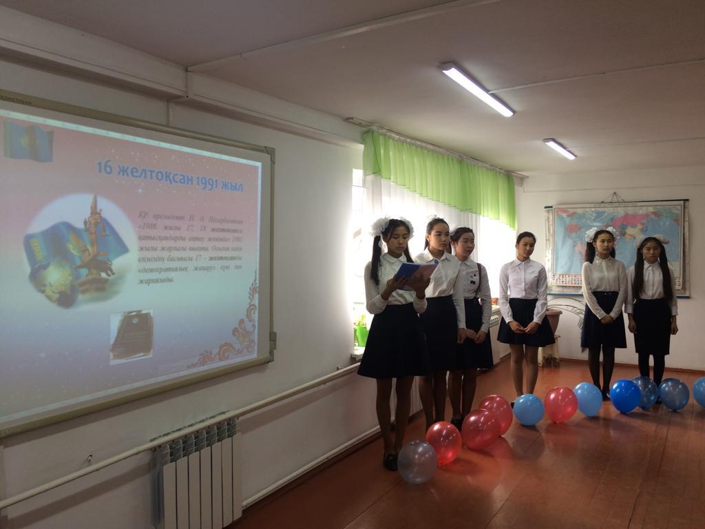 Сабақ барысында жүргізуші жүргізіп, ең бірінші Әнұраннан бастады. Одан кейін «Тәуелсіздік таңы» тақырыбында көрініс қойылды, көріністе әжесі мен баласы тәуелсіздіктің мағынасы туралы айтылды. Көріністен кейін оқушылар желтоқсан тақырыбында тақпақтарын айтты және Сот, Қайрат тақырыбында көрініс қойылды. Көріністе Қайраттың рөлін сомдаған Спандияр өте жақсы дәрежеде ойнап шықты. Аружан мен Жалғас «Желтоқсан желі» өлеңін айтты. Тәуелсіздікке қалай қол жеткізгеніміз жайында оқушылар өз ойларын айтып шықты және 10-сынып жігіттері «Менің Қазақстаным» өлеңі, қалған оқушылар «Тәуелсіздік» тақырыбында тақпақтарын айтты және Қуанышбай Гүлсім өзінің «Желтоқсан» тақырыбына арналған өлең жолдарын айтты. Соңында «Атамекен» әнін Аружан айтып тәрбие сағатымызды қорыттық. Қорыту барысында тәрбие-ісі жөніндегі орынбасары Тулегенова Лиза тәтей тәрбие сағатының өте жақсы деңгейде өтілгені туралы айтты.