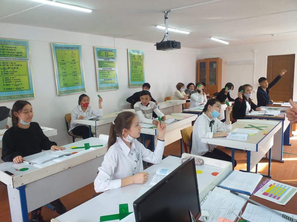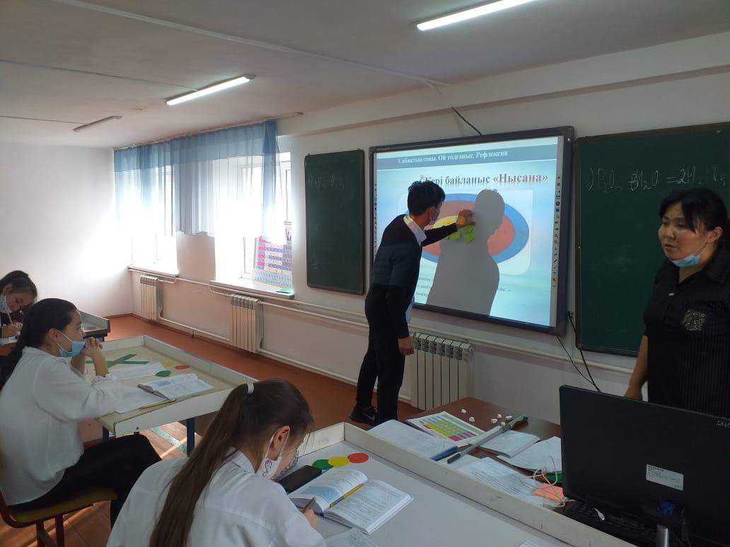 Жетістігі: Сабақ өте жақсы ұйымдастырылған. Сабақ барысында мұғалім үй тапсырмасын сұрауда «Quizizz» және сабақты бекіту кезеңінде «Kahoot» платформаларын тиімді қолданып, оқушының сабаққа деген қызығушылықтарын арттыра білді. Оқулықпен, дәптермен жұмыс жасады, есептер шығарды. Сабақ соңындағы керібайланыс түрінің «Нысана» әдісі тиімді таңдалған.