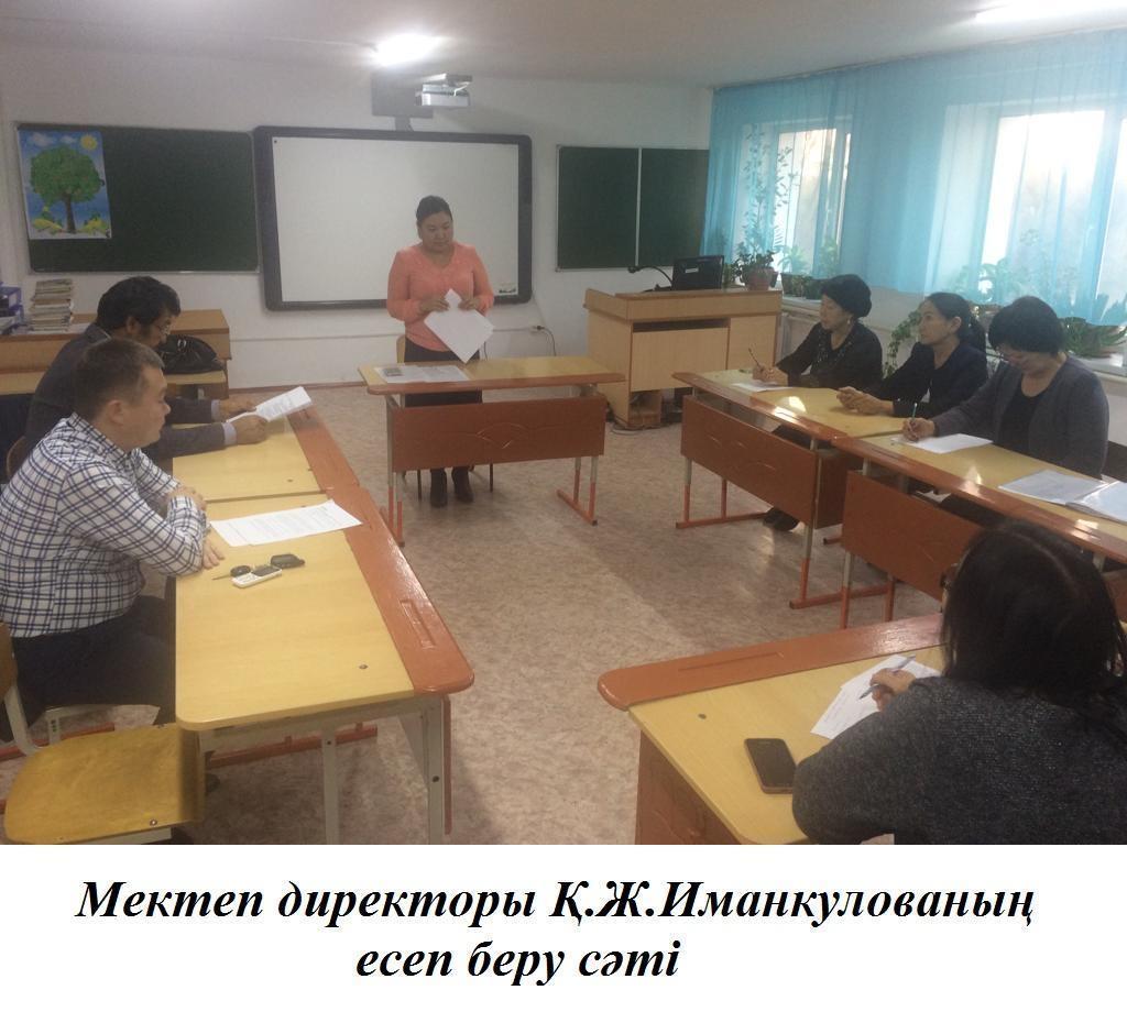 «Қазақстан Республикасының білім беру реформаларының негізгі мақсаты- білім беру жүйесін жаңа экономикалық ортаға бейімдеу. Болашақта өркениетті, дамыған елдің қатарына ену үшін заман талабына сай білім қажет. Өз сөзін мектеп директоры қазіргі уақытта білім ордасында -334 оқушы білім алды, 21 сынып комплектісі бар. Оқушылардың І тоқсан бойынша көрсеткен білім сапасы 57 пайыз. Өздеріңізге белгілі 2017-2018 оқу жылында 1,2,5,7 сыныптар жаңартылған білім мазмұнына көшіп,5 күндік оқу күніне көшіріліп, жаңаша талаптармен білім алуда.