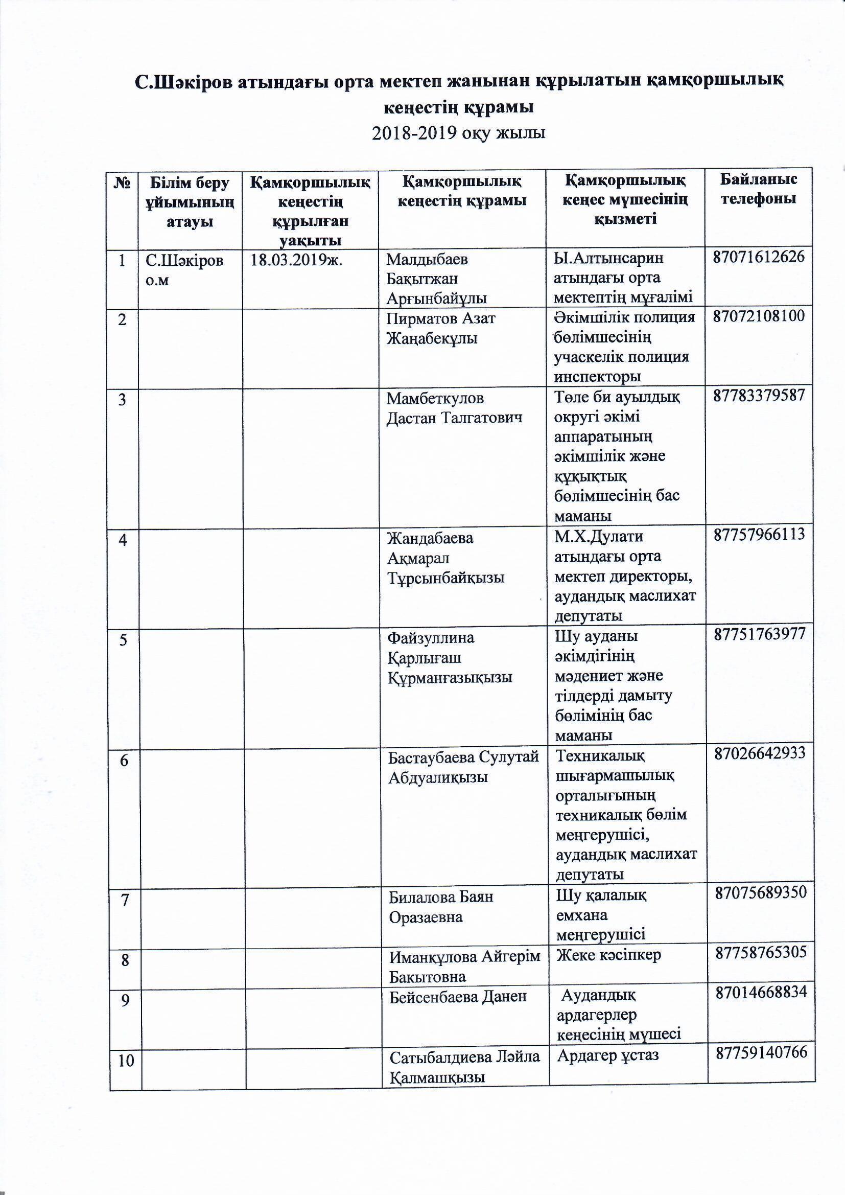 20 март 2019 0 1 2 3 4 5 С.Шәкіров атындағы орта мектеп жанынан құрылатын қамқоршылық кеңестің құрамы