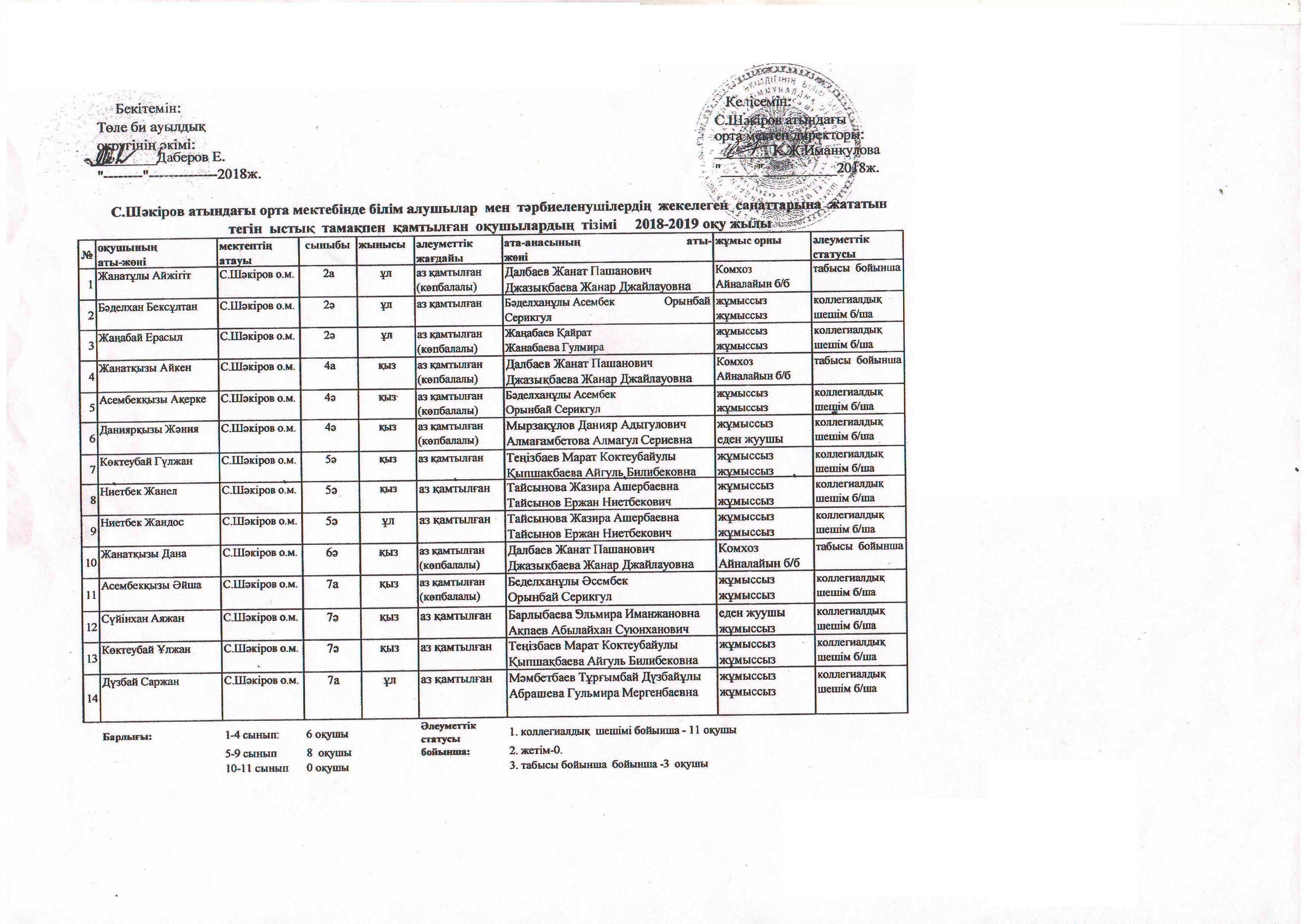 Тегін ыстық тамақпен қамтылған оқушылардың тізімі 2018-2019 оқу жылы » Средняя школа им.Шакирова. Шу ауданы. Шуский район