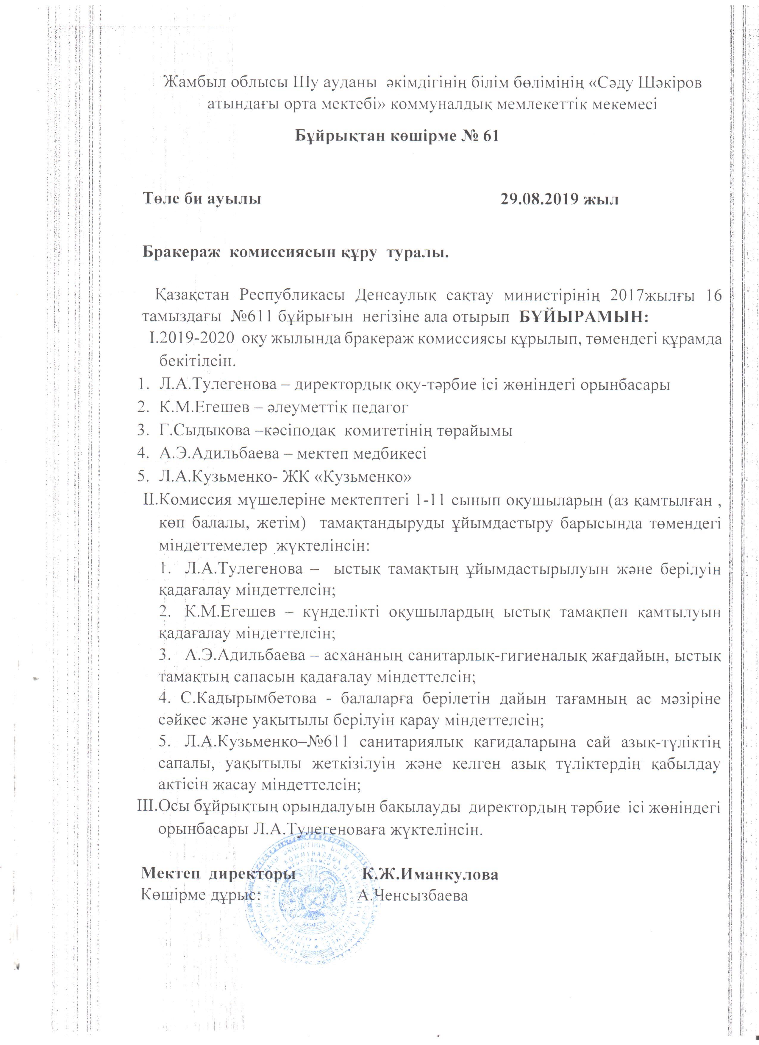 ҚР Денсаулық сақтау министрлігінің 2017 жылдың 16 тамызындағы «Білім беру объектілеріне қойылатын санитариялық-эпидемиологиялық талаптар» санитарлық қағидаларын бекіту туралы №611 бұйрығы негізінде медбике А.Адильбаева асханадағы ыстық тамақ бірілетін күн сайын ағымдағы жылдың қыркүйектің 12-е дейін бракераж журналына жазу арқылы тағамның сапасына органалептикалық бағалау жүргізсе, күнделікті оқушылардың ыстық тамақпен қамтылуын әлеуеметтік педагог К.М.Егешевке жүктелген.