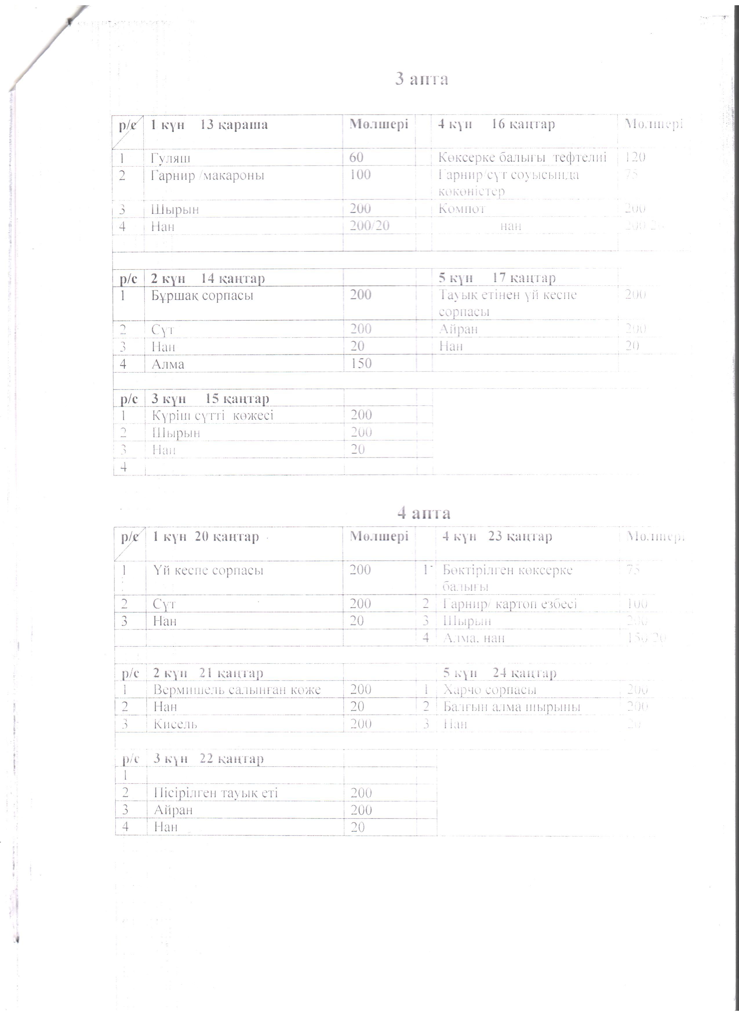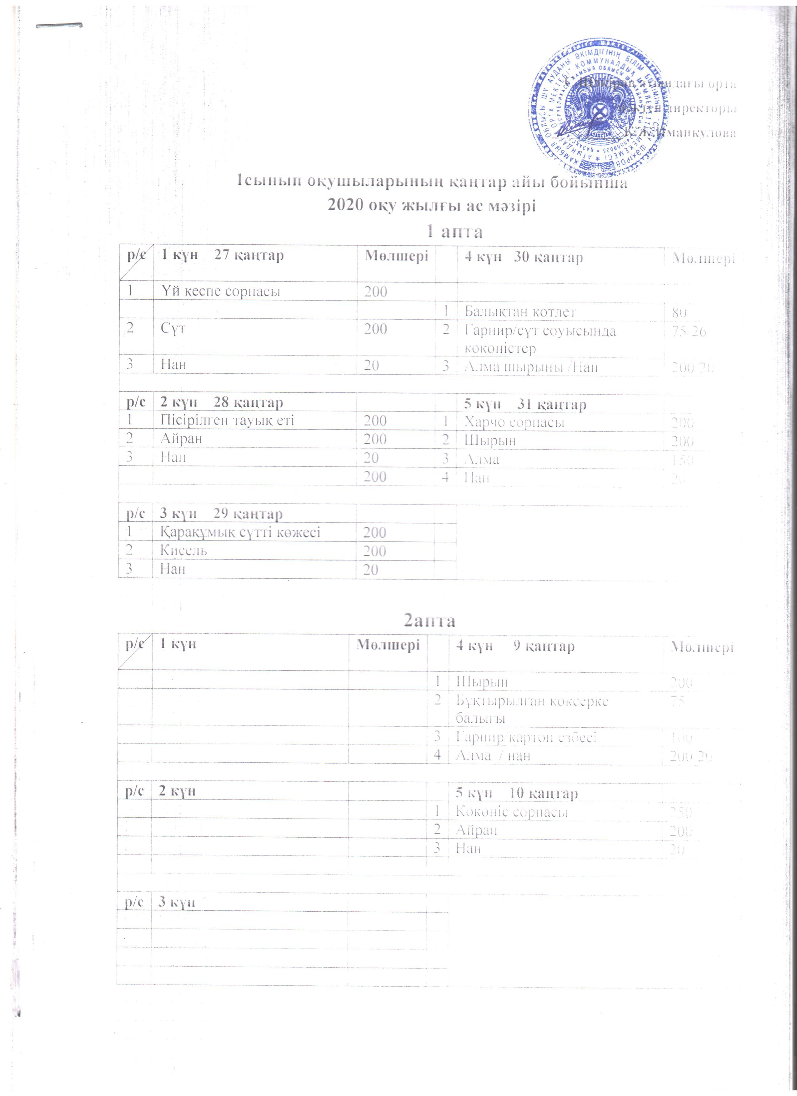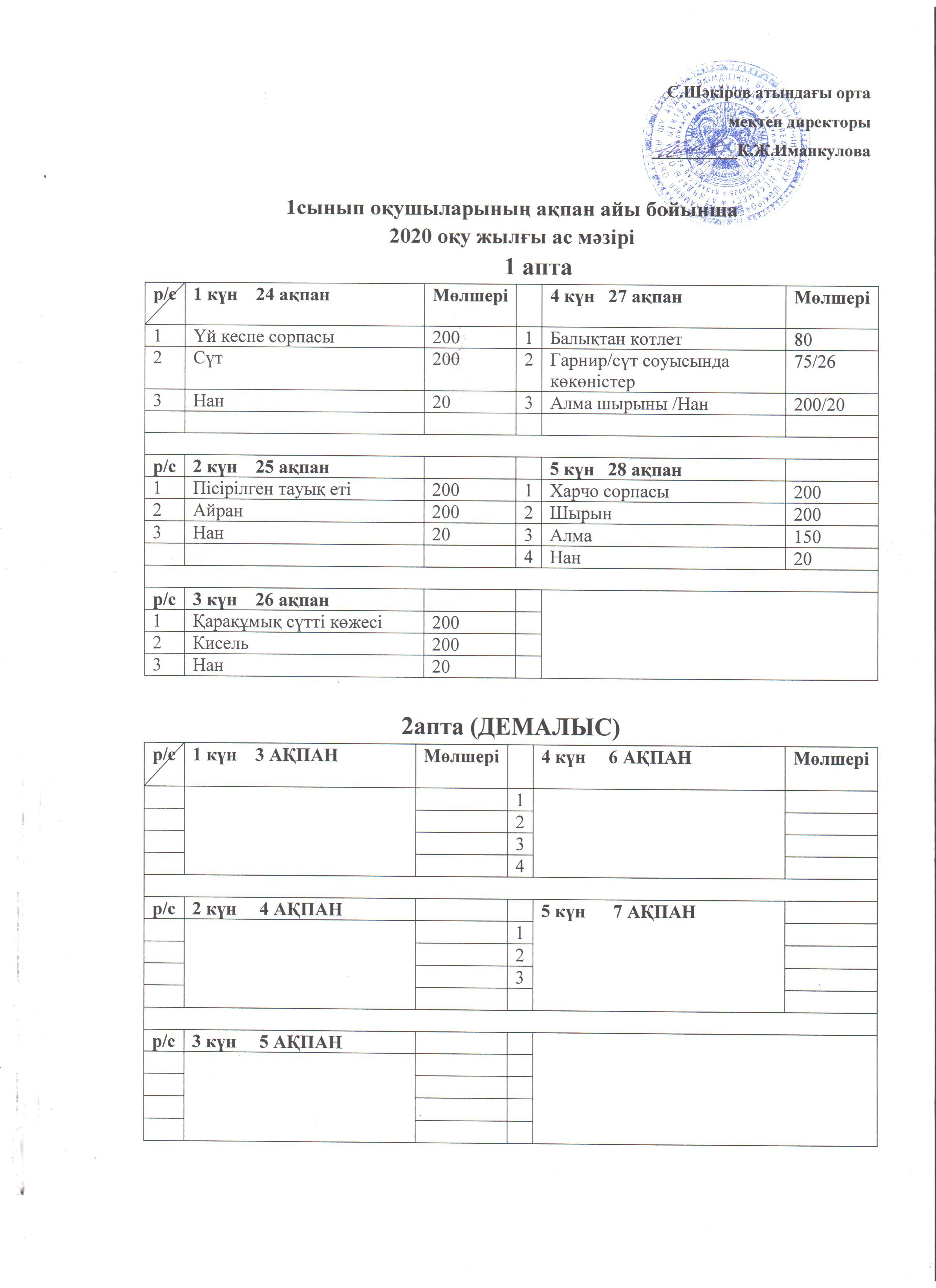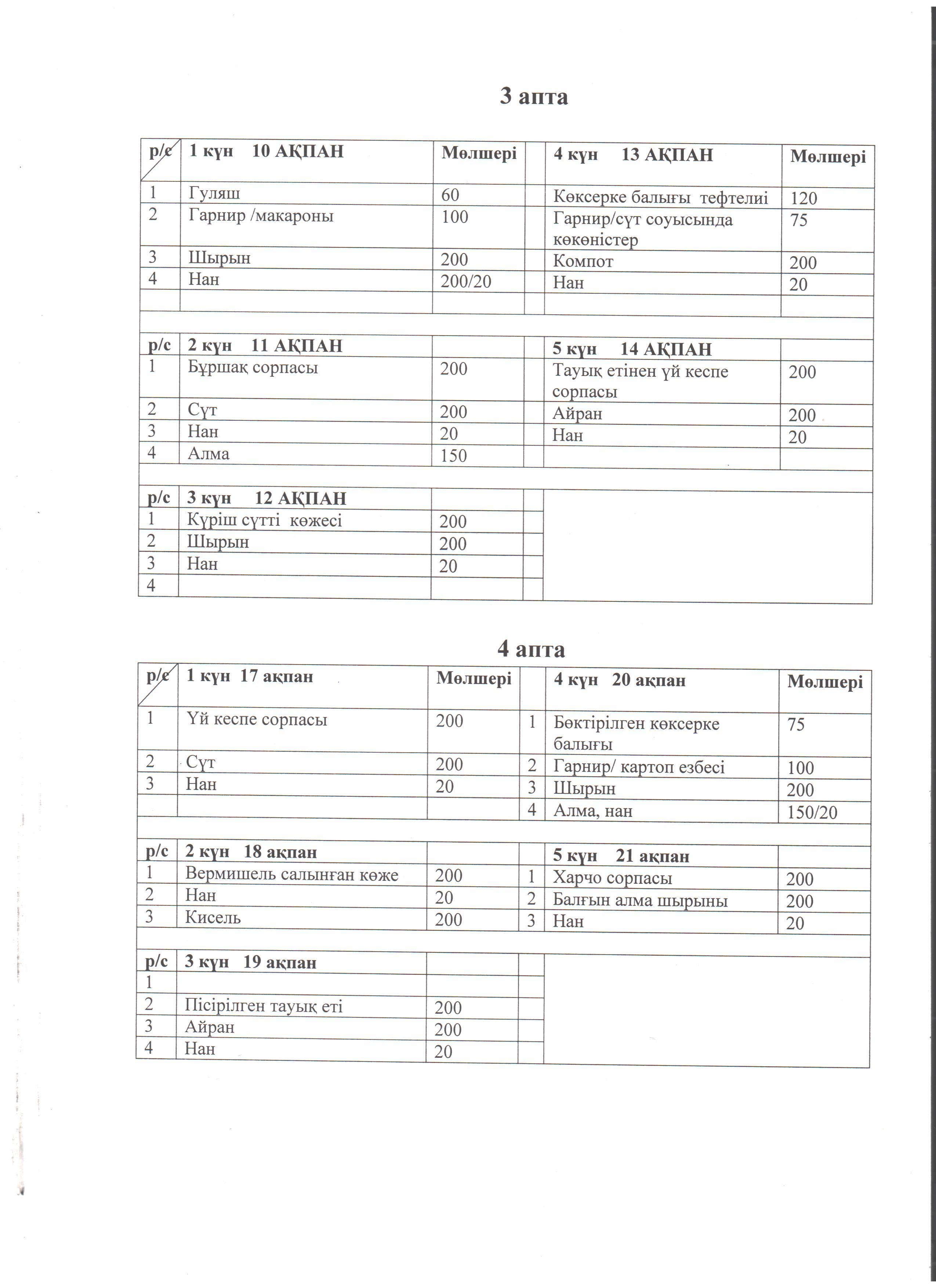 1 сынып оқушыларының ас мәзірі » Средняя школа им.Шакирова. Шу ауданы. Шуский район
