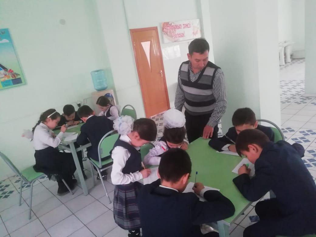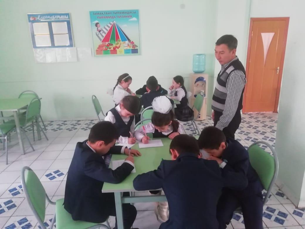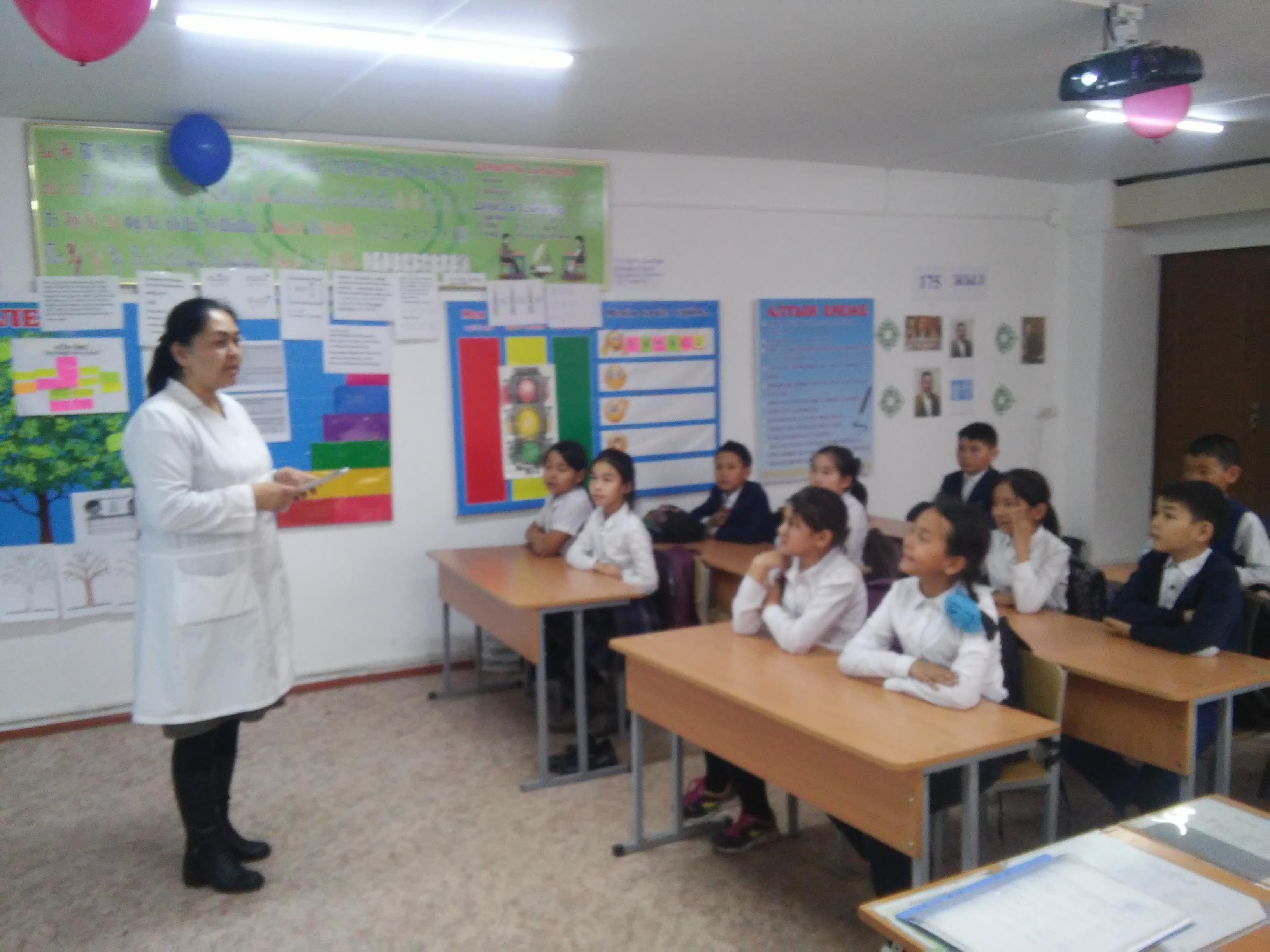 Мектеп медбикесі А.Адильбаева және әлеуметтік педагог К.Егешев бірлесе отырып 1сынып оқушыларымен «Дұрыс тамақтану денсаулық кепілі» тақырыбында баяндама оқып, талқылап, интерактивті тақтадан тақырыпқа байланысты суреттер мен бейнероликтер көрсетілді.