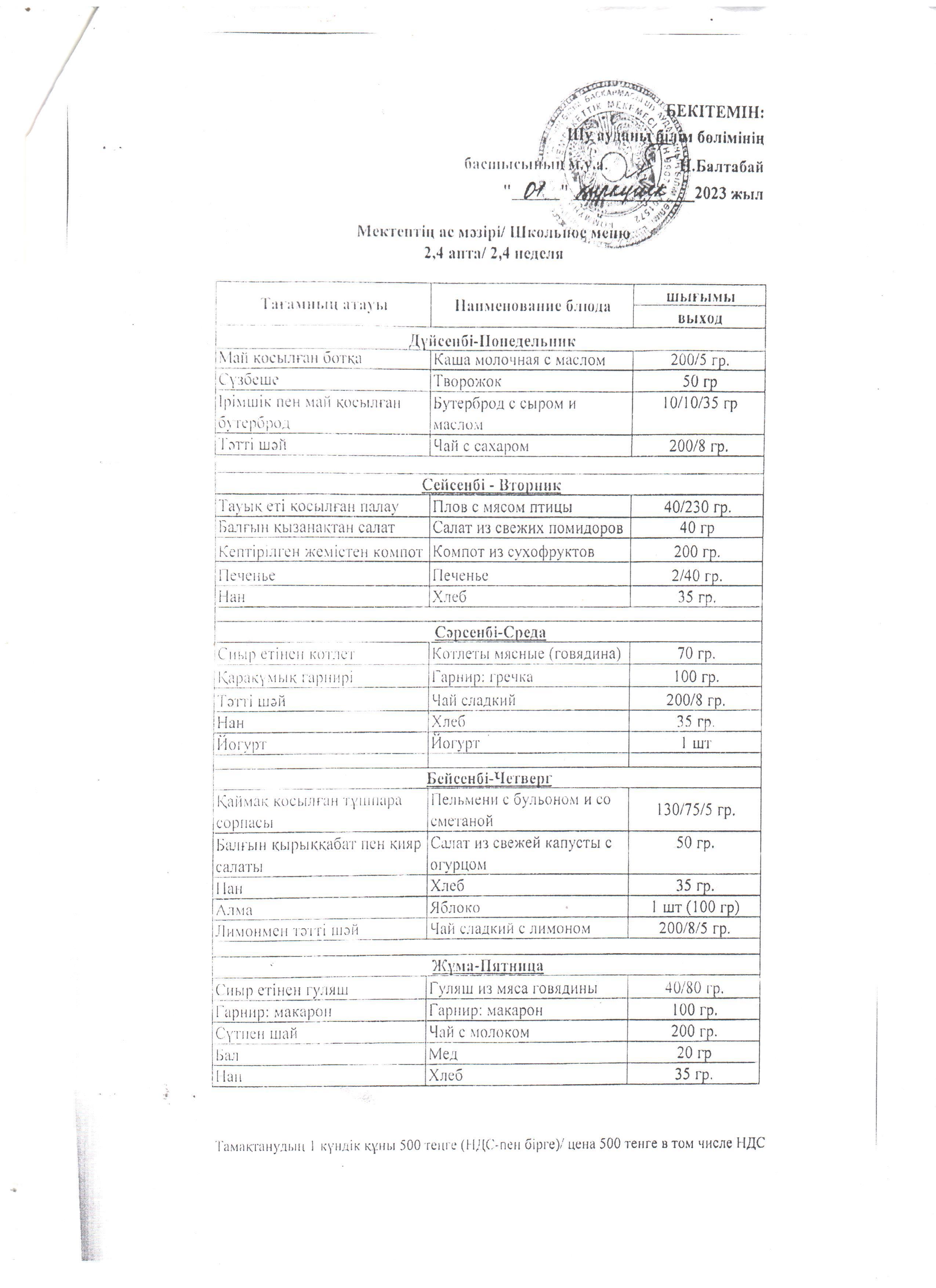Ас мәзірі қыркүйек 2023ж. » Средняя школа им.Шакирова. Шу ауданы. Шуский район