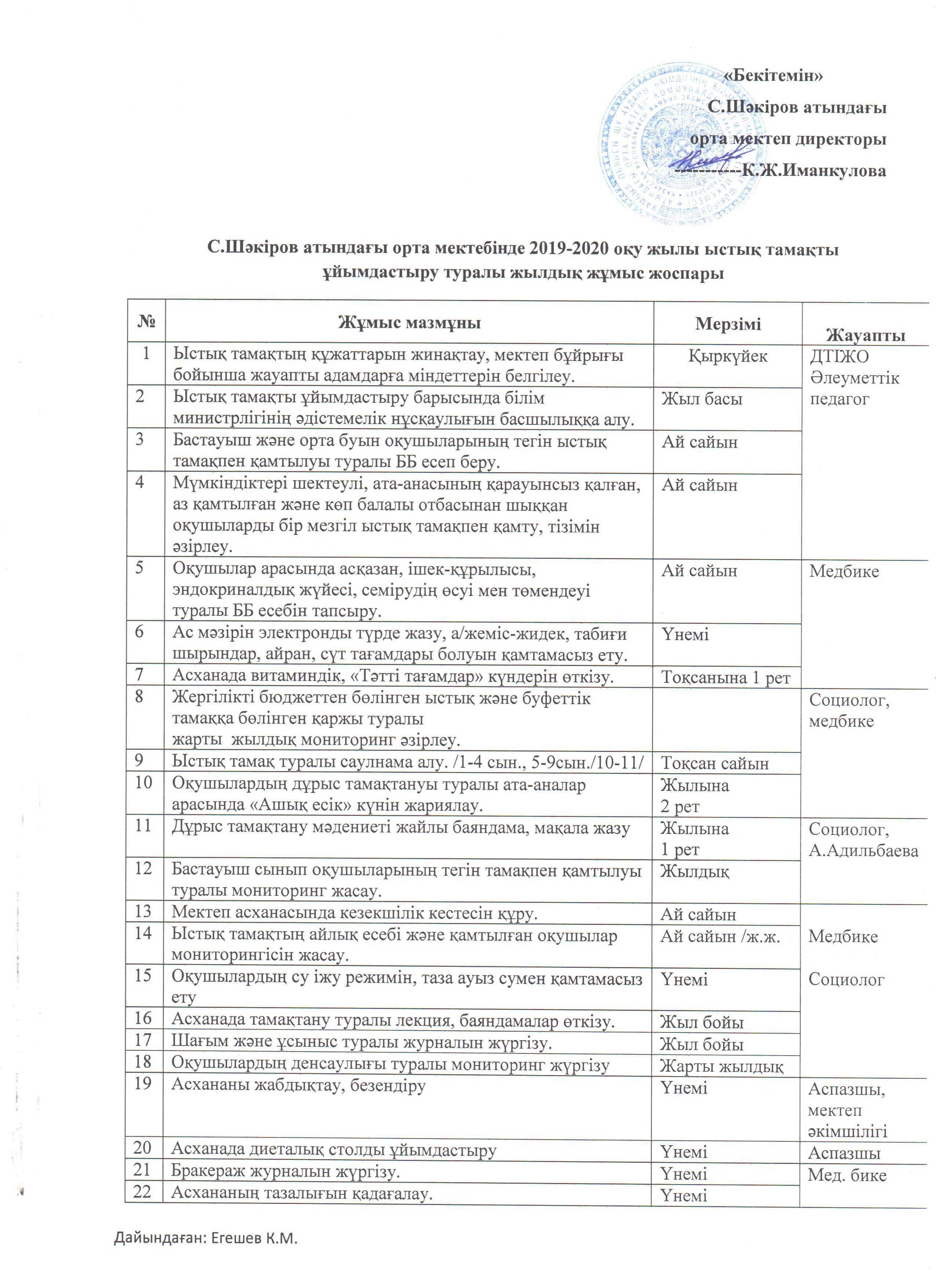 Ыстық тамақты ұйымдастыру жоспары » Средняя школа им.Шакирова. Шу ауданы. Шуский район