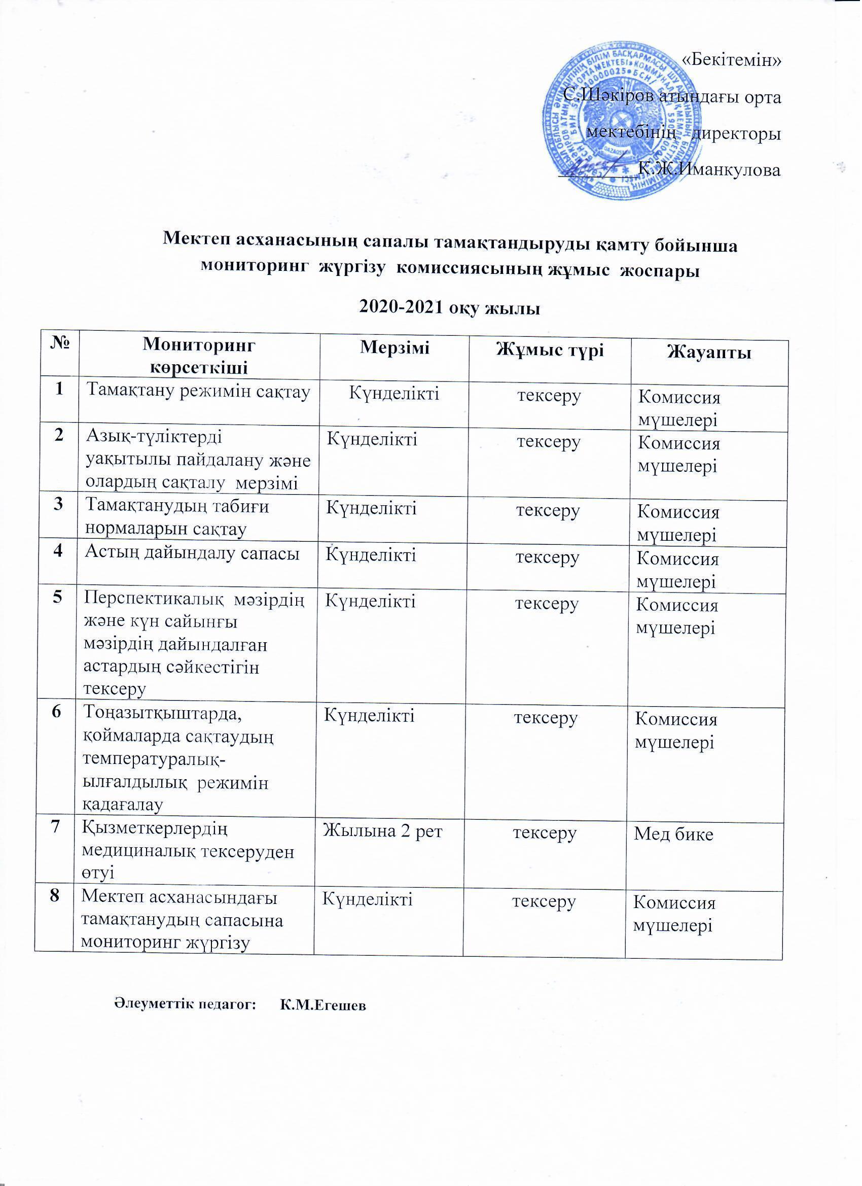 Ыстық тамақты ұйымдастыру жоспарлары » Средняя школа им.Шакирова. Шу ауданы. Шуский район